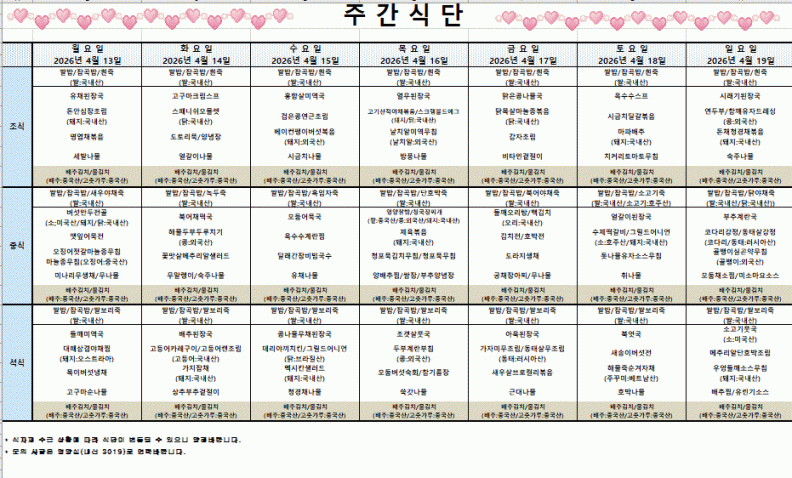 260413-260419식단표 페이지 정보 작성자 영양실 작성일26-04-07 15:35 조회78회 댓글0건 관련링크 이전글 다음글 목록 본문 260413-260419식단표 이전글 다음글 목록