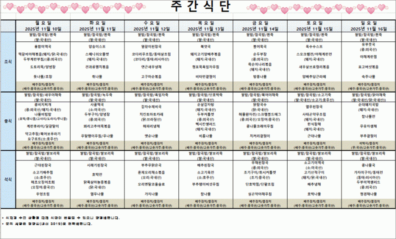 251110-251116식단표 페이지 정보 작성자 영양실 작성일25-11-05 10:13 조회167회 댓글0건 관련링크 이전글 다음글 목록 본문 251110-251116식단표 이전글 다음글 목록