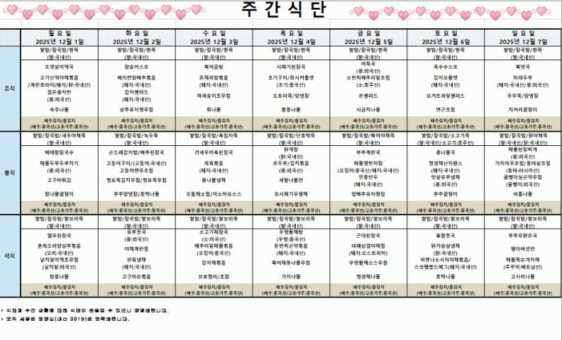 251201-251207식단표 페이지 정보 작성자 영양실 작성일25-11-25 15:49 조회83회 댓글0건 관련링크 이전글 다음글 목록 본문 251201-251207식단표 이전글 다음글 목록