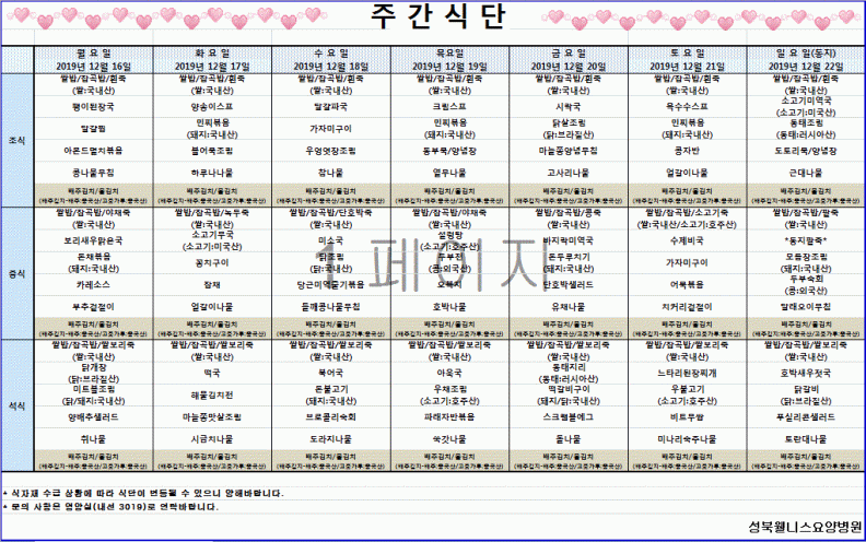 12월3주식단(12.16~12.22) 페이지 정보 작성자 영양실 작성일19-12-14 09:00 조회11,686회 댓글0건 관련링크 이전글 다음글 목록 본문 이미지를 클릭해 주세요. 이전글 다음글 목록