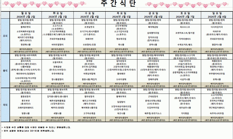 260202-260208식단표 페이지 정보 작성자 영양실 작성일26-01-27 13:09 조회80회 댓글0건 관련링크 이전글 다음글 목록 본문 260202-260208식단표 이전글 다음글 목록
