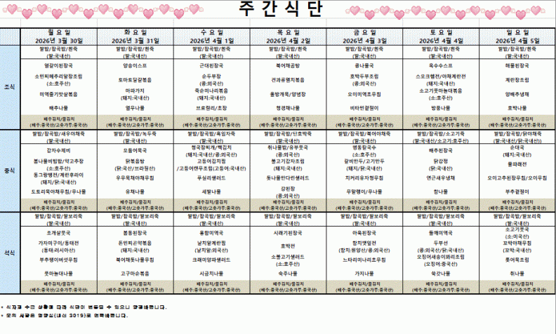 260330-260405식단표 페이지 정보 작성자 영양실 작성일26-03-25 10:18 조회83회 댓글0건 관련링크 이전글 다음글 목록 본문 260330-260405식단표 이전글 다음글 목록